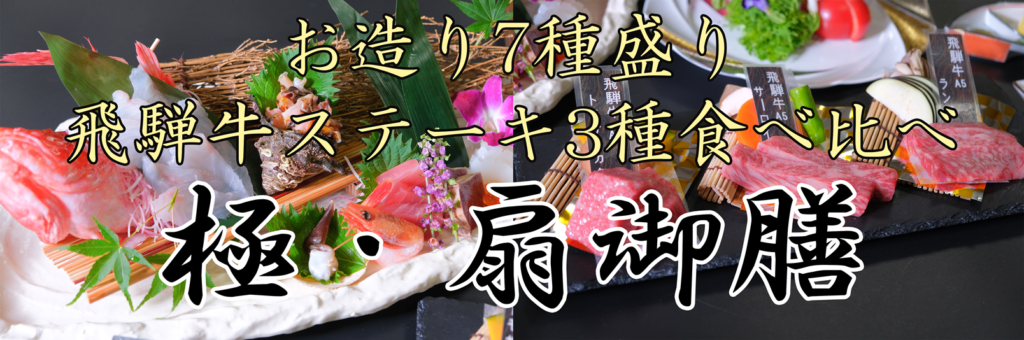 新鮮な地魚を中心にした豪華七種のお造りに、三種の部位を食べ比べる飛騨牛の極上ステーキ。